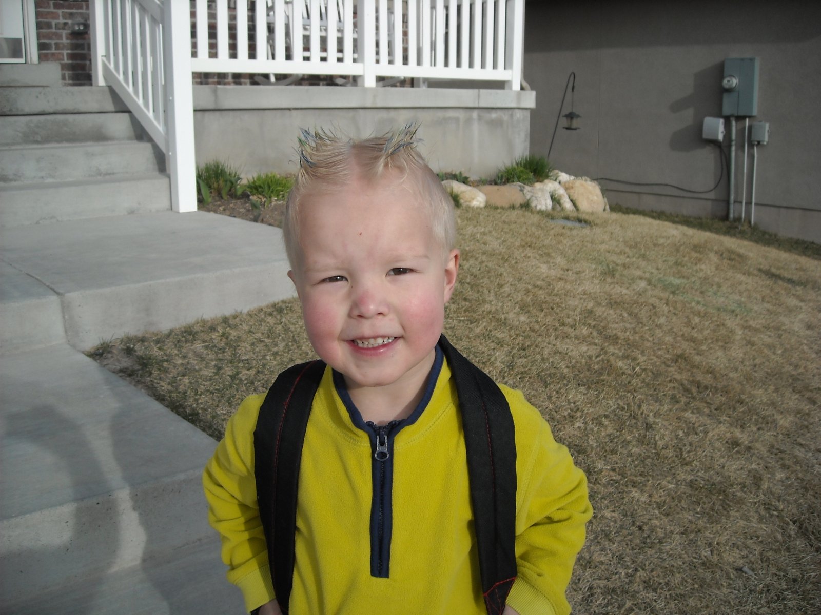 Gator had Spirit week at Preschool. He was so excited. He really looked forward to each activity. They did crazy hair day first. He was very methodical about his hair choice. Everyone already had seen most of his normal hairdoos (I made up that last word) So he asked what there really was left to do.. I told him I would think of something and let him know. When I approached him with the double hawk with color he was in... We colored it with blue and green Crayola markers. Those guys are awsome because they wash right out!